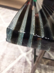 The DV-GLASS® was born in 2018 from a desire pursued by Daniele and Vittorio Livi (the founder of FIAM Italia): their ideas mainly disclosed the willingness to obtain a glass thickness never seen before (up to 36 mm) in the world of furniture, as well as to reinvent a material presenting multiple facets by optimizing all the stages of the productive process, thus fully embracing concepts such as those concerning circular economy and environmental sustainability. The technique that lays behind the DV-GLASS® production consists in sectioning a sheet of glass into many little strips by mainly using transparent, smoked or bronze glass. Hence, the union of those strips, placed next to one another, makes it possible to obtain several chromatic combinations. The significant variability and the remarkable craftsmanship of both the melting process and the assembly lead to the unique and original character of any new slab, that can be achieved in really big dimensions.