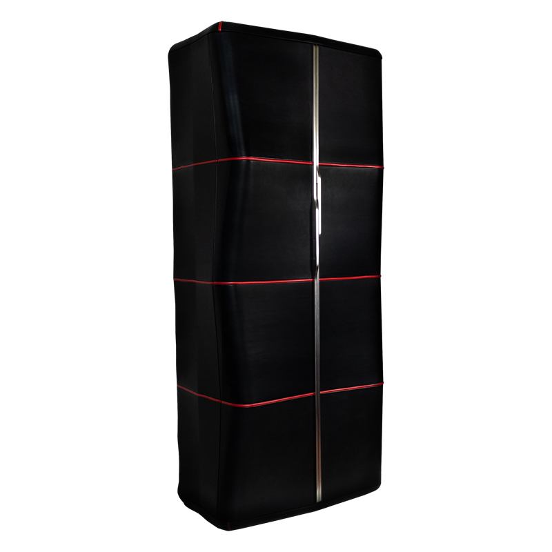 Armoured armoire for watches and jewels lined in black leather and details in red leather. Accessories in satin palladium. Inside the safe 17 watch winders made in Switzerland and a secret compartment.