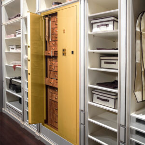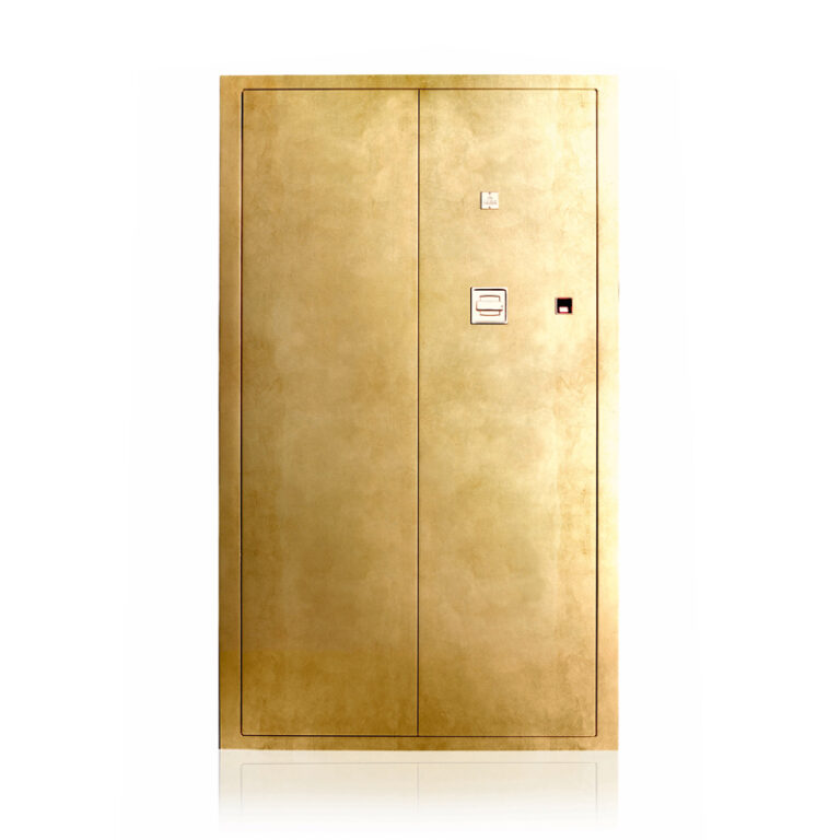 Armoured jewelry case with pull out necklace bars. Shiny gold steel. Inside drawers in elm briar, matte finish, 24 karats gold plated brass accessories.