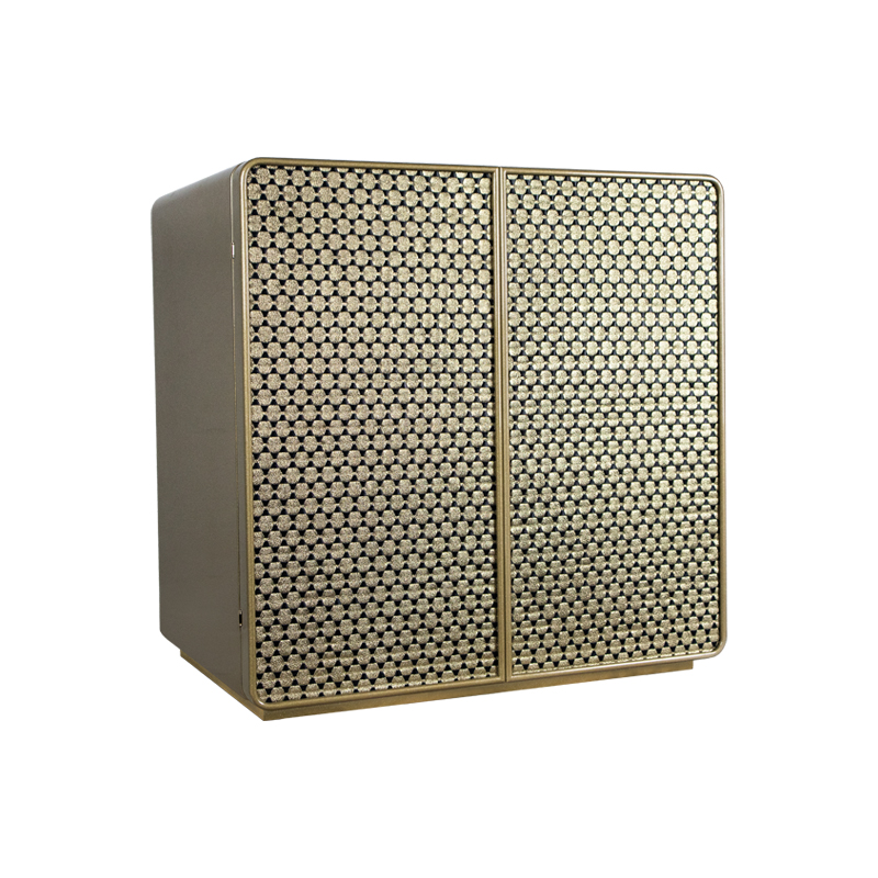 Armored jewelry cabinet covered in gold and black hand threaded leather. Varnished outside in metallic gold color. Accessories in 24 karats gold plated brass. Drawers covered in black leather and inside lined with ultrasuede.