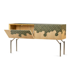 Primavera is one of the four consoles in the “Seasons” line, the result of research into textures and shapes derived from the plant world. The Hebanon furniture is the result of research into a new balance between nature and man: man is increasingly distant from his primordial condition and feels the need to find a new contact with the natural world. This reflection led to the creation of Primavera, a sideboard made of natural and green-stained ash with an acid-etched steel base. A fresh and bright inlay wraps the surfaces with a texture that evokes the wonder of the first leaves born after a long winter.
