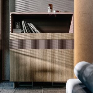 Diana is a tall dining sideaboard, characterized by a day compartment, two veenered smokey grey oak doors, a milled unique lacquered drawer. The structure is resting on top of a titanium finishing metal frame, crossed by a wood panel covered in leather with a raw cut at both ends.