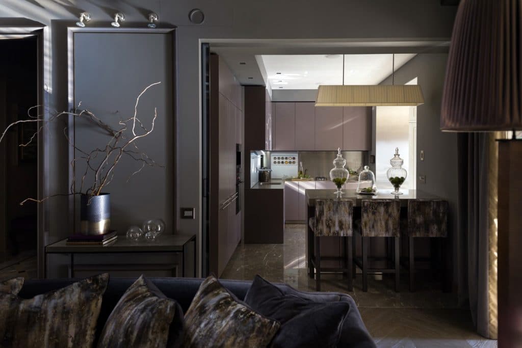 “While decorating the interiors, the main wishes of the customers were taken into account to reflect the atmosphere of an old country house filled with antiques and collectibles, to bring the spirit of oriental colonialism into the apartment, while organically implementing an ultramodern kitchen, sauna, private cinema, smart-home technology and intelligent light, with a lot of light scenarios, as well as fill the space with modern art-objects to counterbalance and ‘refresh’ the environment”, concludes Alexandrine Lukach.